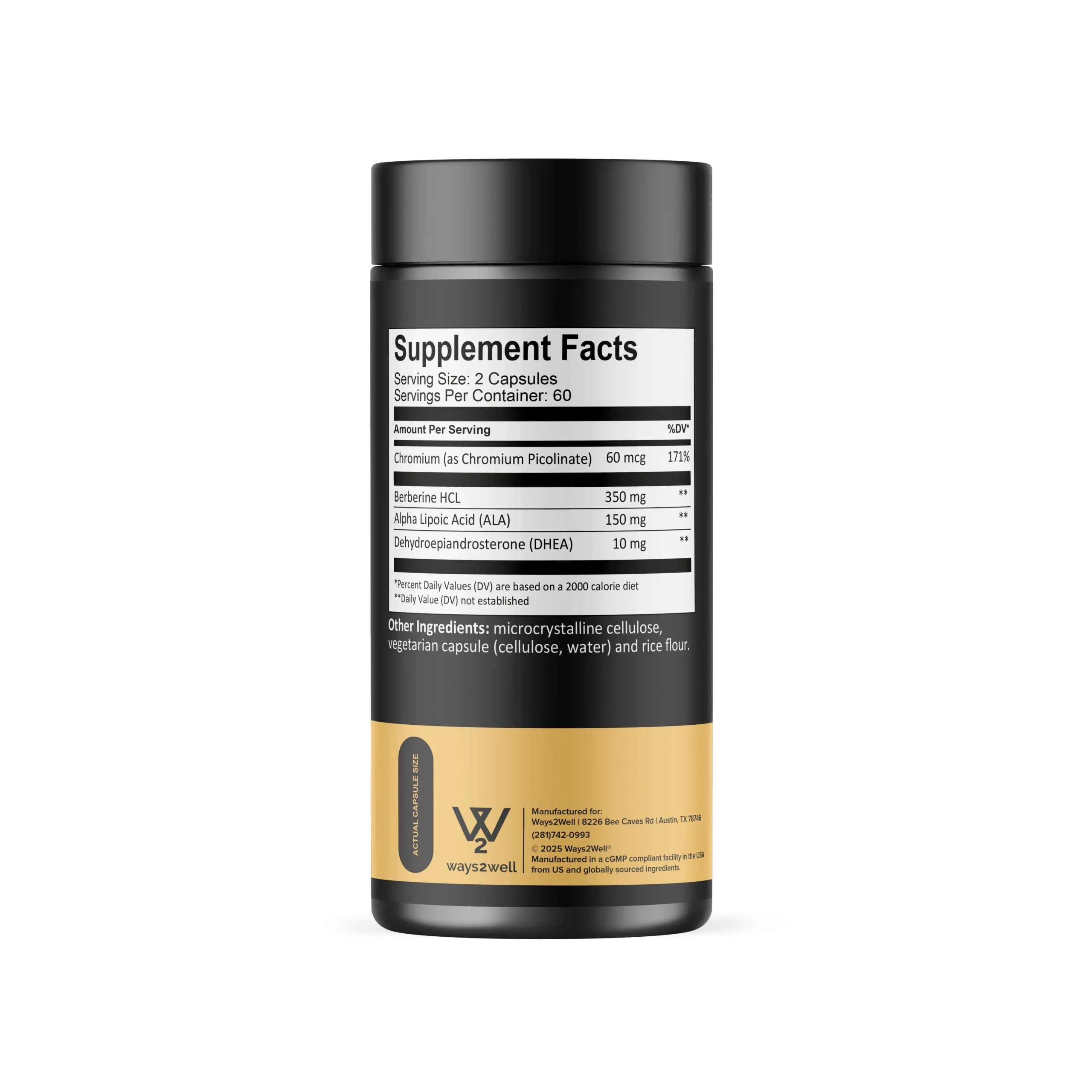 Crave Control Complex combines four research-supported ingredients to promote metabolic wellness. Each capsule provides chromium picolinate (60mcg), berberine HCl (350mg), alpha lipoic acid (150mg), and DHEA (10mg) in precisely measured amounts for optimal effectiveness.*